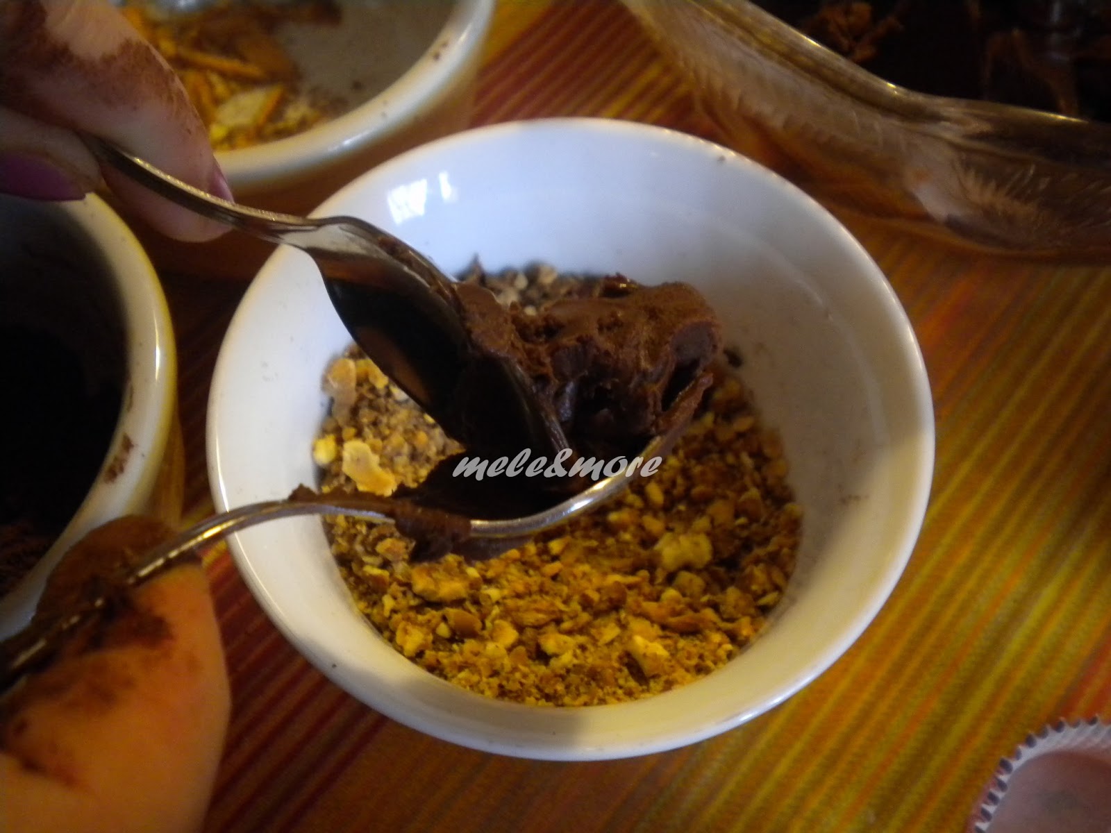 Tritare le nocciole e metterle in una ciotola, versare il cacao amaro e la scorza d'arancia tritata in altre 2 ciotole.